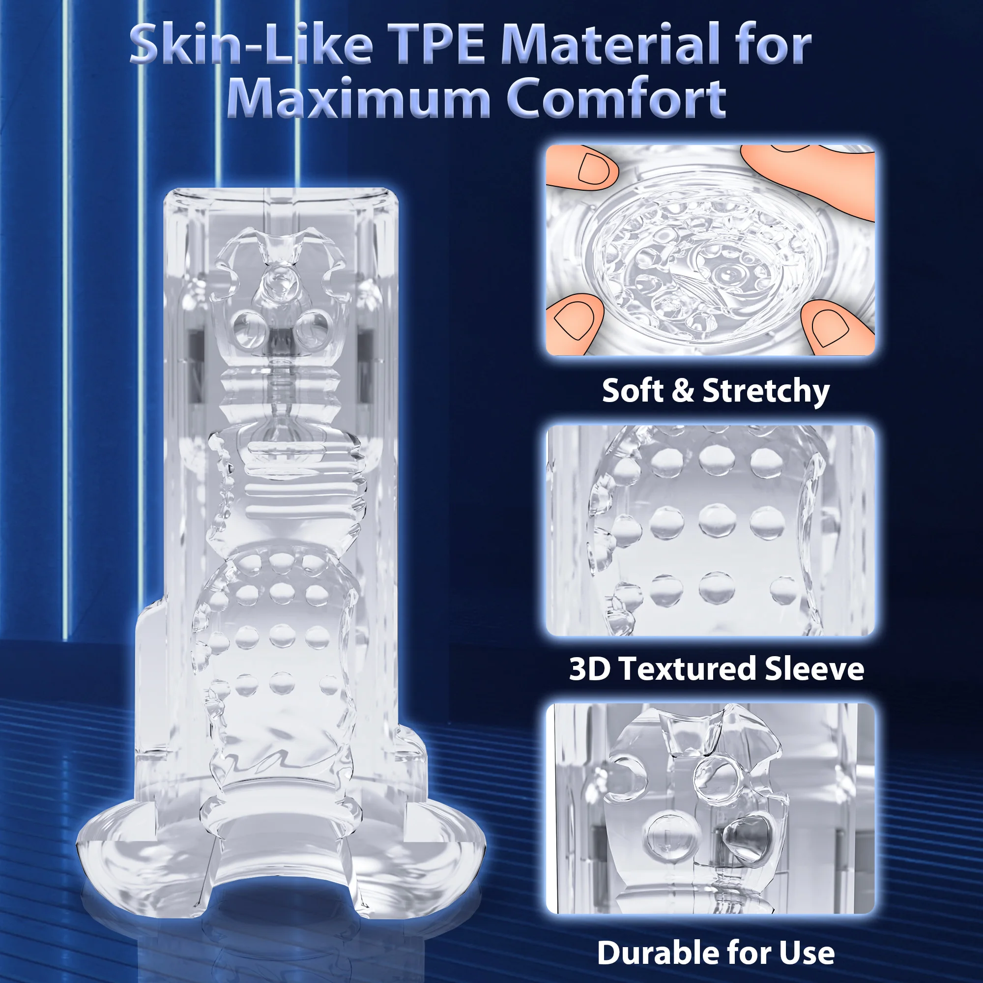 Apply water-based lubricant before use. Select your preferred mode using the interface. After use, clean the sleeve thoroughly with warm water and mild soap. Store in a cool, dry place away from direct sunlight to maintain material integrity.